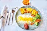 Two skewers of ground beef, served with saffron, basmati rice, grilled tomatoes and vegetables.